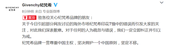 印花T恤中的錯(cuò)誤而引發(fā)大家的關(guān)注,對(duì)此我們深表歉意。對(duì)于任何的人為疏忽與錯(cuò)誤,我們一定立即糾正并引以為戒。紀(jì)梵希品牌一貫尊重中國(guó)主權(quán),堅(jiān)決擁護(hù)一個(gè)中國(guó)原則,堅(jiān)定不移。