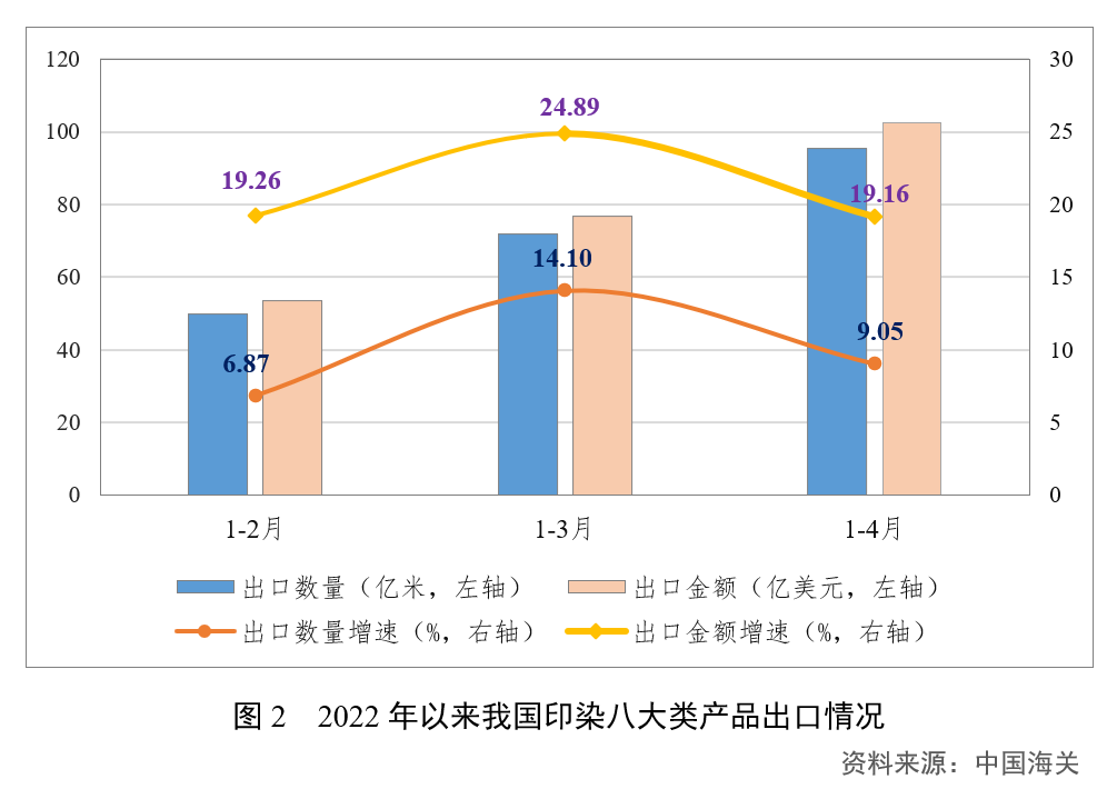 據(jù)中國海關(guān)統(tǒng)計數(shù)據(jù),2022年1-4月印染八大類產(chǎn)品出口數(shù)量95.59億米,同比增長9.05%,增速較1季度下滑5.05個百分點;出口金額102.49億美元,同比增長19.16%,增速較1季度下滑5.73個百分點;出口平均單價1.07美元/米,同比提高9.27%,增速較1季度小幅回落0.19個百分點。隨著世界多國放松疫情限制措施,國外市場需求逐步釋放,疊加4月人民幣匯率對出口形成利好,我國印染產(chǎn)品出口保持增長態(tài)勢,值得注意的是,出口增速有所放緩。一方面,3月開始的上海疫情對多地企業(yè)的物流、貨物出港造成影響,上海港作為全球最大的進(jìn)出口港口,疫情防控導(dǎo)致物流效率下降,對出口造成了直接約束;另一方面,國外供應(yīng)鏈持續(xù)修復(fù),生產(chǎn)供給逐步增加,加大我國出口競爭壓力,在國內(nèi)疫情防控形勢趨嚴(yán)環(huán)境下,印染訂單有向東南亞等地轉(zhuǎn)移趨勢。