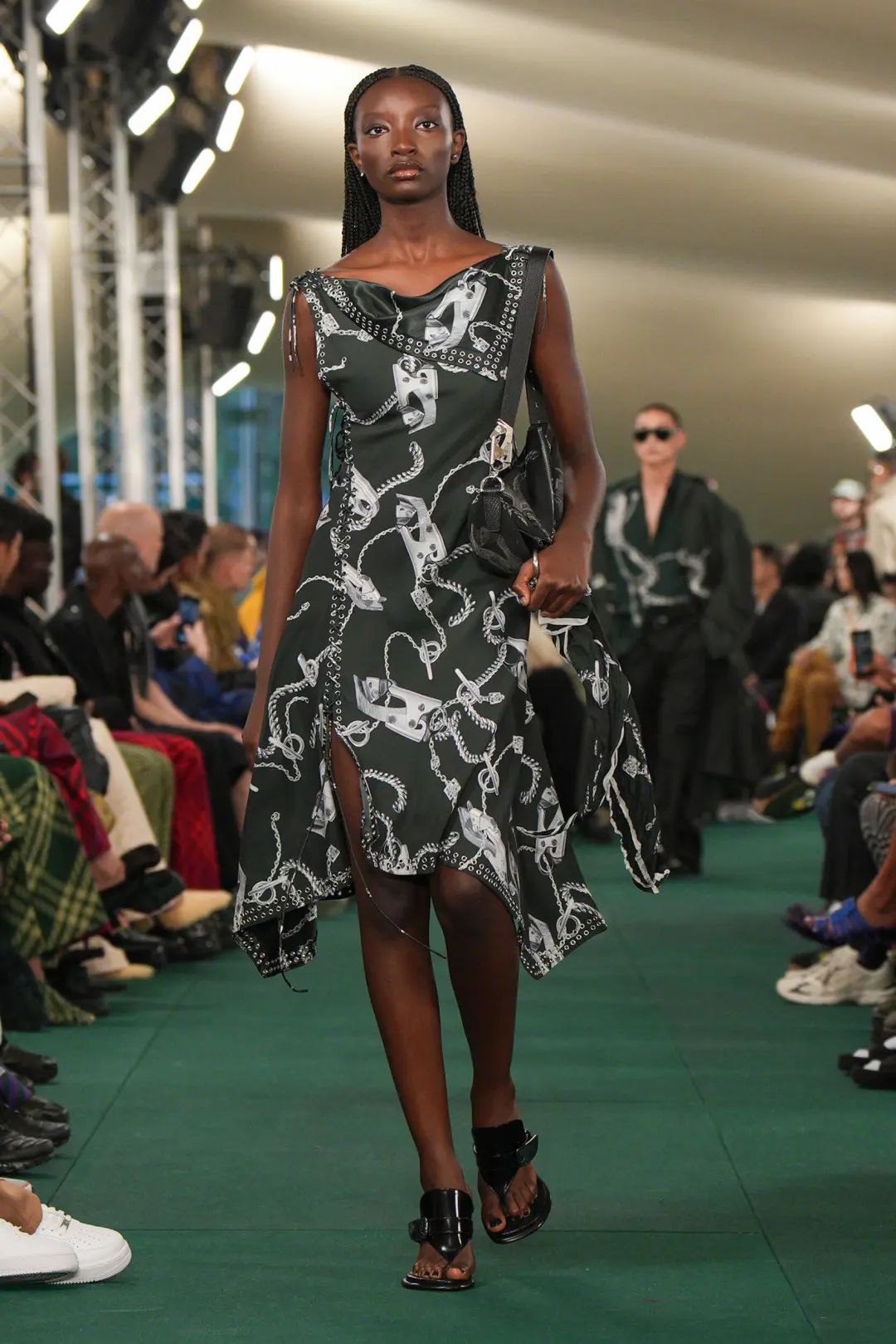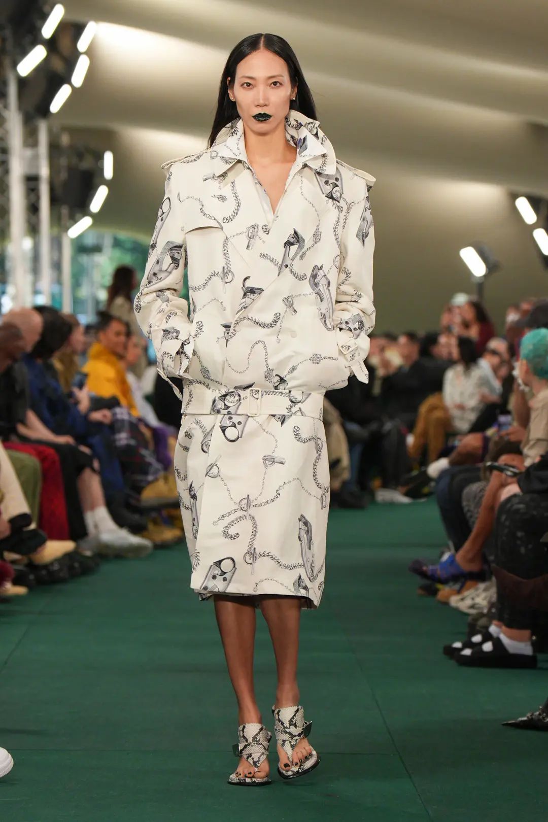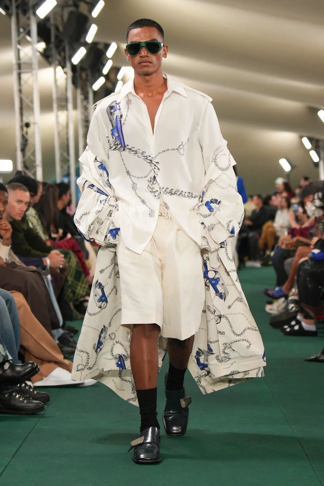 這場秀在倫敦 Highbury Fields 公園舉辦,并在公園的戶外草坪上搭建起一頂綠色格紋的巨型帳篷。值得注意的是,品牌上一場秀的舉辦地也是在倫敦的一處公園,其選址表達(dá)了品牌對戶外探索的傳承。