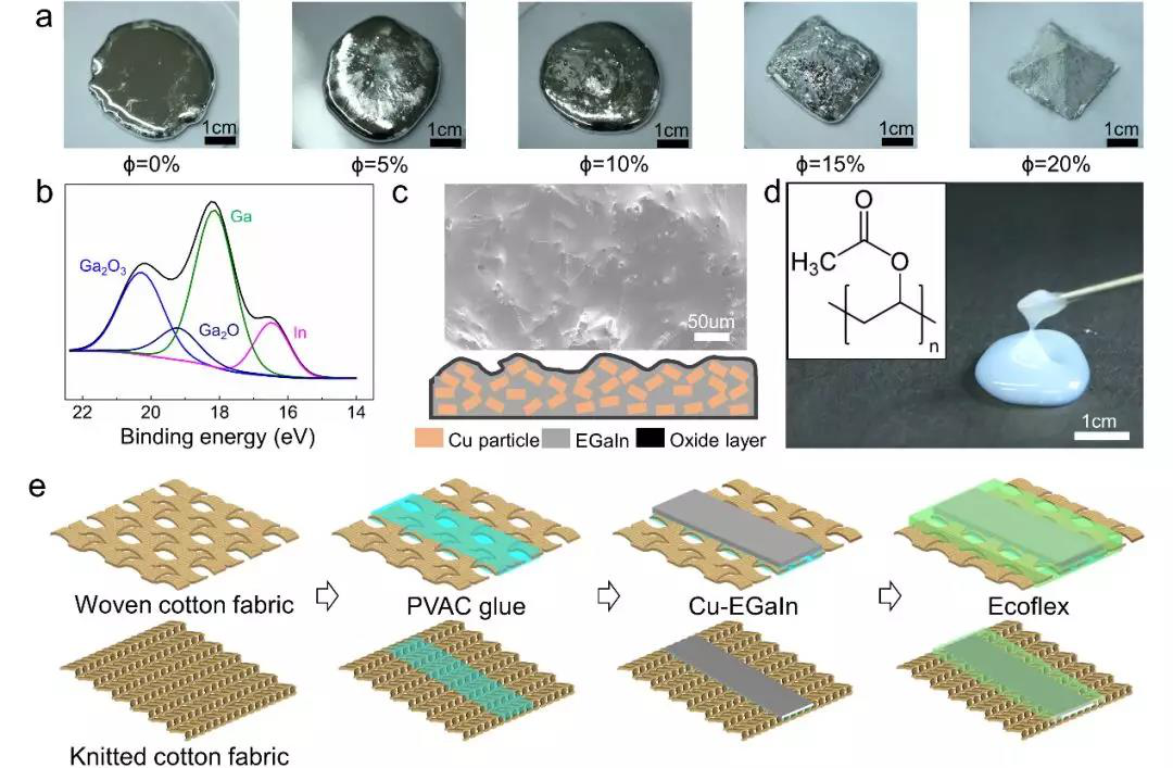 傳統(tǒng)的服裝面料往往由紗線通過(guò)針織或機(jī)織而成,其表面較為粗糙,這種粗糙的界面使得液態(tài)金屬難以附著。因此,研究人員使用絲網(wǎng)印刷方法首先在棉布表面覆蓋一層聚乙酸乙烯酯(PVAC)膠膜,PVAC膠膜滲透進(jìn)纖維之間的空隙,并在面料表面形成光滑平整的界面,而且這層膠膜對(duì)液態(tài)金屬具有極好的黏附性,可以將液態(tài)金屬牢固地黏附在其表面。