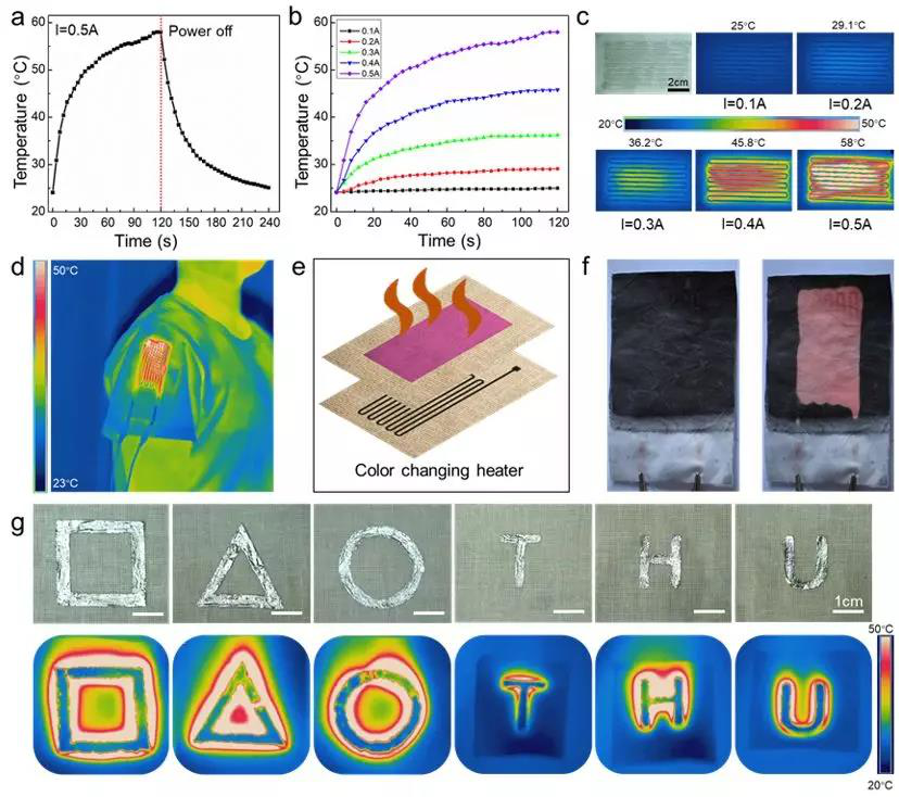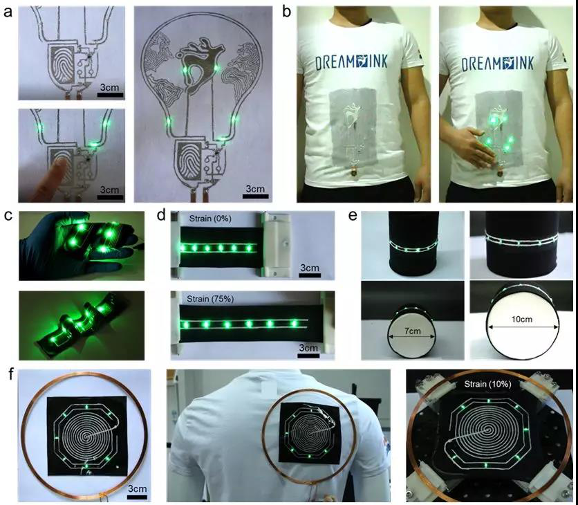 研究人員展示了一系列基于該項(xiàng)技術(shù)制備的液態(tài)金屬智能服裝。這種液態(tài)金屬智能服裝的制備方法操作簡(jiǎn)單,不需要復(fù)雜昂貴的設(shè)備,與剛性電子器件結(jié)合可以制造出多功能、大面積的可穿戴柔性電子設(shè)備,為開發(fā)個(gè)性化定制智能服裝提供了新的解決途徑。