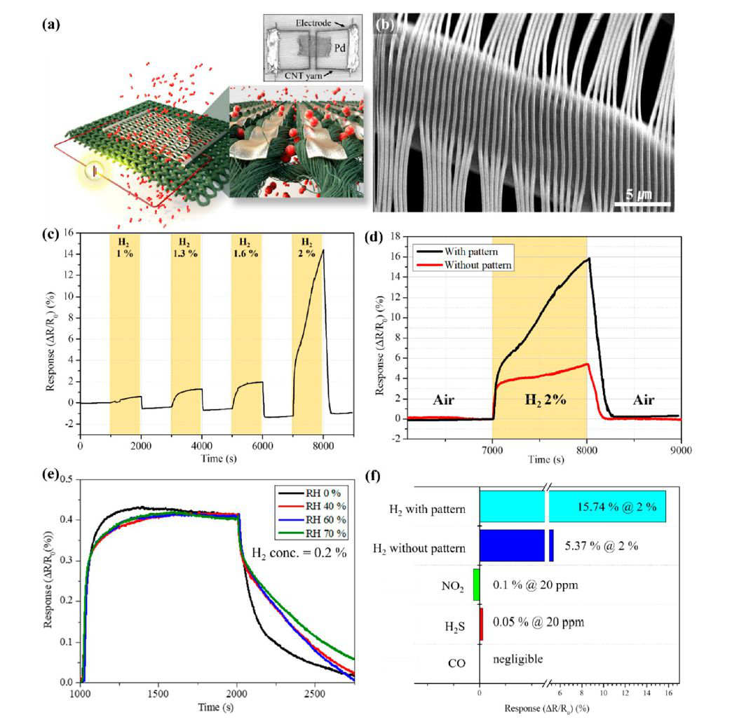 圖示二:nTP-SP工藝在制備檢測氫氣的Pd納米結(jié)構(gòu)中的應(yīng)用:(a)氫氣感測原理圖,使用紡織襯底的傳感器;(b)納米結(jié)構(gòu)的L/S為200nm /200的SEM圖像,在織物襯底上制備納米材料; (c) 對于H2檢測的(ΔR / R 0 )響應(yīng)曲線;(d) 比較Pd納米粒子和薄膜轉(zhuǎn)移到紡織基板上的響應(yīng)曲線; (e)傳感器在不同相對濕度條件下對H2響應(yīng)(070%);(f)各種氣體(NO 2 、H 2 S、CO)的選擇性測試。