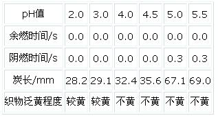 我們將阻燃劑工作液調(diào)節(jié)不同pH值進(jìn)行試驗(yàn),結(jié)果見表2,