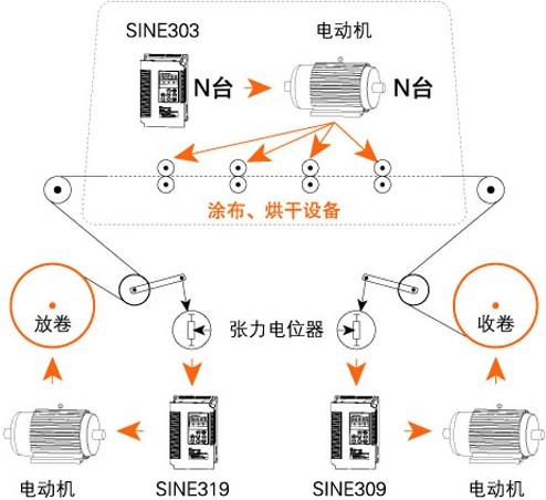 涂布及烘干:SINE303開環(huán)矢量控制變頻器,四臺,比例聯(lián)動控制,主信號和微調(diào)信號按設(shè)定比例疊加運行。