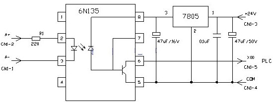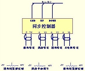 系統(tǒng)的同步控制我們采用了兩種方式;第一種方式較為簡單,技術(shù)要求低用模擬電壓為給定控制主伺服電機(jī)和進(jìn)落布烘房變頻器的給定(原理如圖3示),為使線速度一致采用數(shù)字式同步控制器實(shí)現(xiàn)同一主給定下各路不同比例輸出(價格比PLC專用D/A模塊便宜,輸出模擬電壓為12位D/A,精度也足夠,除主電機(jī)外,進(jìn)落布取調(diào)節(jié)布張力的松緊架信號(實(shí)質(zhì)為±5V供電的電位器),因此同步器的數(shù)學(xué)表達(dá)式可描述為:Ui=Um*Ki+Uf*Kfi(輸出最高電壓為10V,其中:Ui為第i路輸出,Um為主令電壓,Ki為第i路輸出比例系數(shù),Uf為該路反饋電壓,Kfi為反饋系數(shù)),實(shí)際調(diào)試中為使布受的張力均勻,特別是升降速時同步效果好,除松緊架反饋系數(shù)合適外,還要注意變頻器的升降速時間參數(shù)設(shè)不可太長,以免反饋信號作用后反應(yīng)時間太慢造成同步不好。我們選用的同步器帶外部升、降數(shù)字信號輸入,即UP與DOWN與其相應(yīng)的地接通可使輸出電壓升高和降低,因給定為內(nèi)部數(shù)字給定,使輸出模擬電壓穩(wěn)定性很好,再采用伺服電機(jī)驅(qū)動從而保證了主傳動的穩(wěn)定。這里值得一提的是我們采用了主伺服電機(jī)驅(qū)動器上編碼器輸出差分信號,來測量主電機(jī)的速度,實(shí)現(xiàn)自動按設(shè)定速度升降速,自動停車,自動判斷導(dǎo)布速等功能,所有參數(shù)可通過觸摸屏進(jìn)行參數(shù)的修改,如升降速時間,導(dǎo)布速調(diào)節(jié)。伺服驅(qū)動編碼器接口到PLC的接口電路如圖4示,不僅實(shí)現(xiàn)了隔離,且完成信號類型和電平轉(zhuǎn)換。