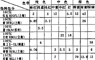 我廠一般選用深藍(lán)HGL、大紅HBGL,黃棕H2RL,紅玉H2GFL、翠藍(lán)S-GL、紫HFRL等分散染料進(jìn)行拼色印花,其次是選用對(duì)棉沾污基本能去除的染料,如大紅、黃、黃棕、紅玉、紫、孔雀藍(lán)等鮮艷色,但是分散藍(lán)或分散藍(lán)與其他染料拼色組成的色漿,經(jīng)印制焙烘、還原清洗時(shí)沾污比較嚴(yán)重,經(jīng)兩次還原清洗后效果并不明顯,只有通過(guò)H2O2輕漂才能去凈。其中福隆藍(lán)S-BGL對(duì)棉沾污嚴(yán)重,多次還原清洗也無(wú)法去盡,但織物色光越洗越萎暗,必須堵絕使用;分散草綠SE-GFL不但其升華牢度差,對(duì)棉沾污更嚴(yán)重,也應(yīng)盡量避免使用。一般用在印花上的分散染料多數(shù)考慮把明亮的品種用于淺淡色澤,給色量高的用于深濃色澤。