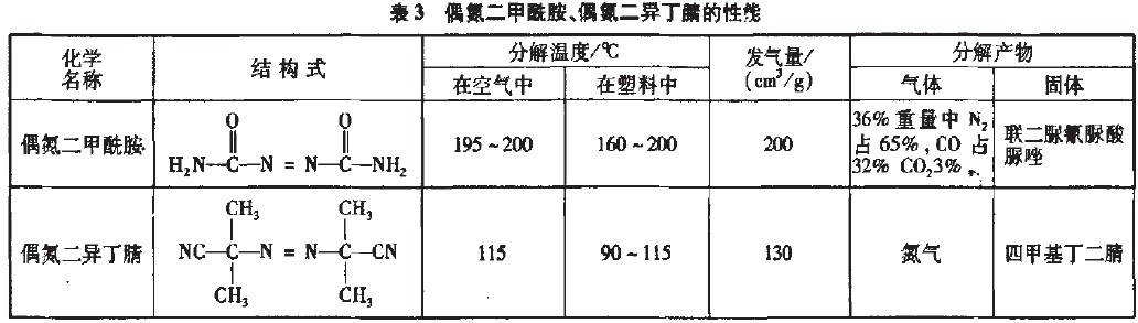 (2)發(fā)泡荊目前常用的發(fā)泡劑為偶氮二甲酰胺反應(yīng)生成氮氣、一氧化碳和二氧化碳的混合氣體,這些氣體在聚乙烯類塑料中滲透速率與在空氣中接近,因此,泡孔均勻,氣味少。而偶氮二異丁腈在分解時放出氮氣及四甲基丁二腈為有毒物質(zhì),現(xiàn)已很少使用(表3)。