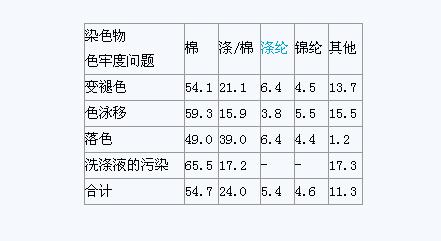 【集萃網(wǎng)觀察】隨著紡織染料應(yīng)用實(shí)踐的發(fā)展和染色物用途的不斷擴(kuò)大,紡織染料染色物特別是活性染料和分散染料等染色物的若干色牢度經(jīng)常發(fā)生達(dá)不到商業(yè)要求或國(guó)內(nèi)外牢度標(biāo)準(zhǔn)的問(wèn)題。例如:活性染料淺色染色物的日曬牢度、活性染料染色物的汗一日光牢度、活性染料深色染色物的水洗牢度與濕摩擦牢度以及分散染料染色物經(jīng)熱定型處理或后整理后的洗滌牢度等問(wèn)題。曾有人對(duì)市場(chǎng)上主要染色物的變褪色和落色等色牢度問(wèn)題作了一個(gè)粗略的統(tǒng)計(jì),大致上存在著表一中所示的狀況:表一 主要染色物發(fā)生的變褪色和落色等色牢度問(wèn)題的比例(單位:%)