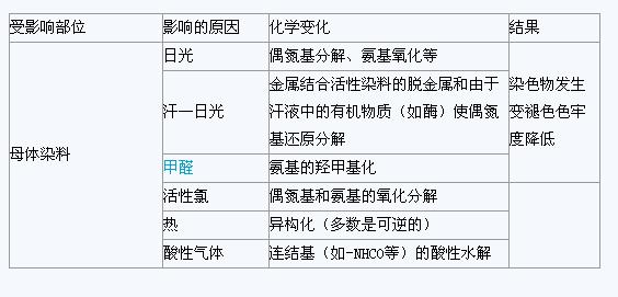 其中母體染料對(duì)活性染料的顏色,溶介度,固著率以及光牢度、汗一日光牢度、氯牢度和受甲醛、熱、酸性氣體等作用發(fā)生的變褪色等起著決定的作用;連結(jié)基把母體染料與活性基部分結(jié)合成為一個(gè)整體,起著平衡兩個(gè)組成部分使其產(chǎn)生優(yōu)異性能的作用,顯然它也會(huì)對(duì)因受化學(xué)物質(zhì)作用發(fā)生的變褪色問(wèn)題起作用;活性基部分中的活性基和親電子中心一起影響著活性染料與纖維間形成共價(jià)結(jié)合的能力以及活性染料的耐氧化劑性、耐酸性氣體性和耐熱性等,活性基部分中的第二取代基連接在親電子中心上,雖然不是活性基,但它也會(huì)影響活性基的反應(yīng)能力,甚至活性染料的某些性能,也就是說(shuō)活性基部分主要是活性基會(huì)對(duì)受氧化劑、酸性氣體和熱作用發(fā)生的染色物落色問(wèn)題起重要作用。由此可見(jiàn),活性染料染色物的變褪色和落色等色牢度問(wèn)題的主要原因可歸結(jié)如表二所示:表二 活性染料染色物發(fā)生色牢度問(wèn)題的原因