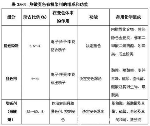 熱敏變色有機(jī)染料是有隱色染料、顯色劑的增干劑(減敏劑)三部分組成,其化學(xué)組成和作用見(jiàn)表38-3: