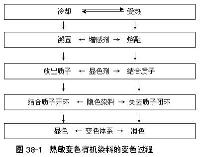 印花熱敏變色有機(jī)染料其變色為可逆的,其變色過(guò)程見(jiàn)圖38-1: