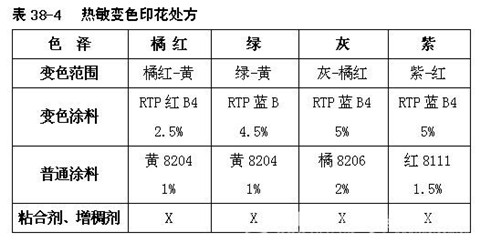 光敏變色印花的工藝流程基本上與涂料印花工藝流程相似:印花(100網(wǎng)目)--烘干(100℃)--低溫焙烘(120℃,5分)。
