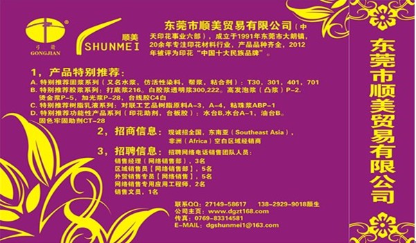 東莞市順美貿(mào)易有限公司,隸屬于東莞市中天膠粘材料有限公司(中天印花事業(yè)六部)公司,1991年成立于東莞市大朗鎮(zhèn),20多年一直專注樹(shù)脂,膠漿,固漿等產(chǎn)品的研發(fā),生產(chǎn),銷(xiāo)售。公司憑借“同等產(chǎn)品品質(zhì),價(jià)格最低;同等產(chǎn)品價(jià)格,品質(zhì)最高”的經(jīng)營(yíng)理念,20多年來(lái)夯實(shí)的產(chǎn)業(yè)基石,公司與時(shí)俱進(jìn)開(kāi)發(fā)新產(chǎn)品,為客戶“量身定做”產(chǎn)品,實(shí)實(shí)在在為客戶解決印花應(yīng)用上技術(shù)難題,爭(zhēng)取做到客戶“一站式”采購(gòu),為公司在化工行業(yè)內(nèi)贏得非常高的口碑,贏得了全國(guó)一大批忠實(shí)的經(jīng)銷(xiāo)商和客戶。