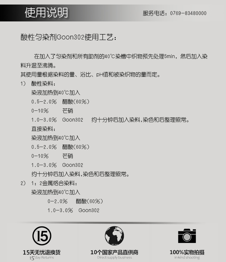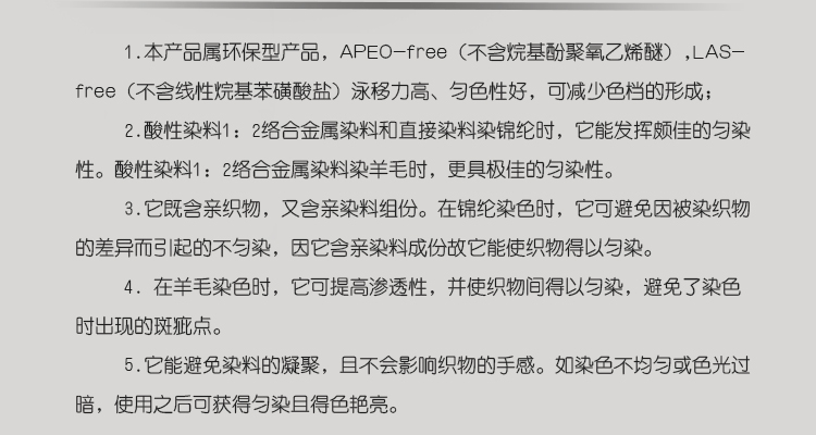推出高效、環(huán)保、節(jié)能、減排的綠色新型助劑、低消耗助劑,無磷、不含APEO、易生物降解的助劑,并致力于減少化學(xué)品使用。