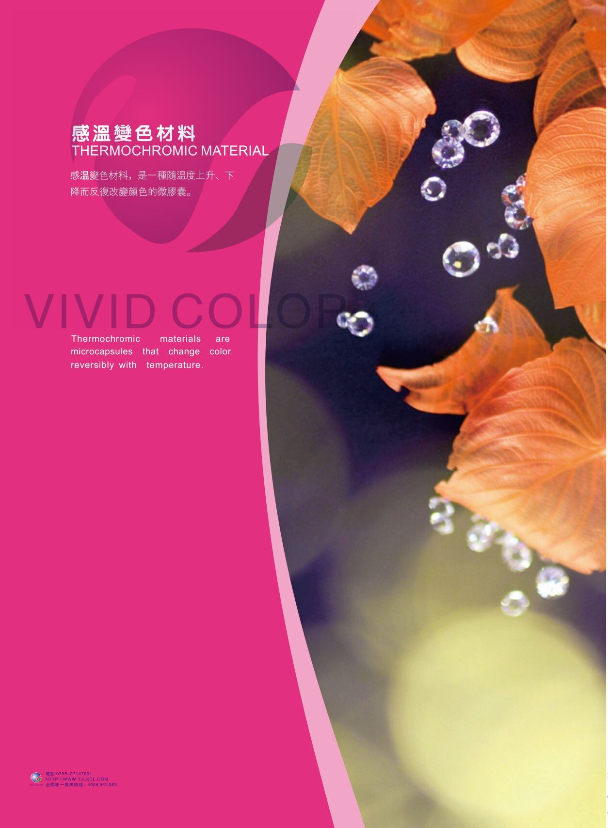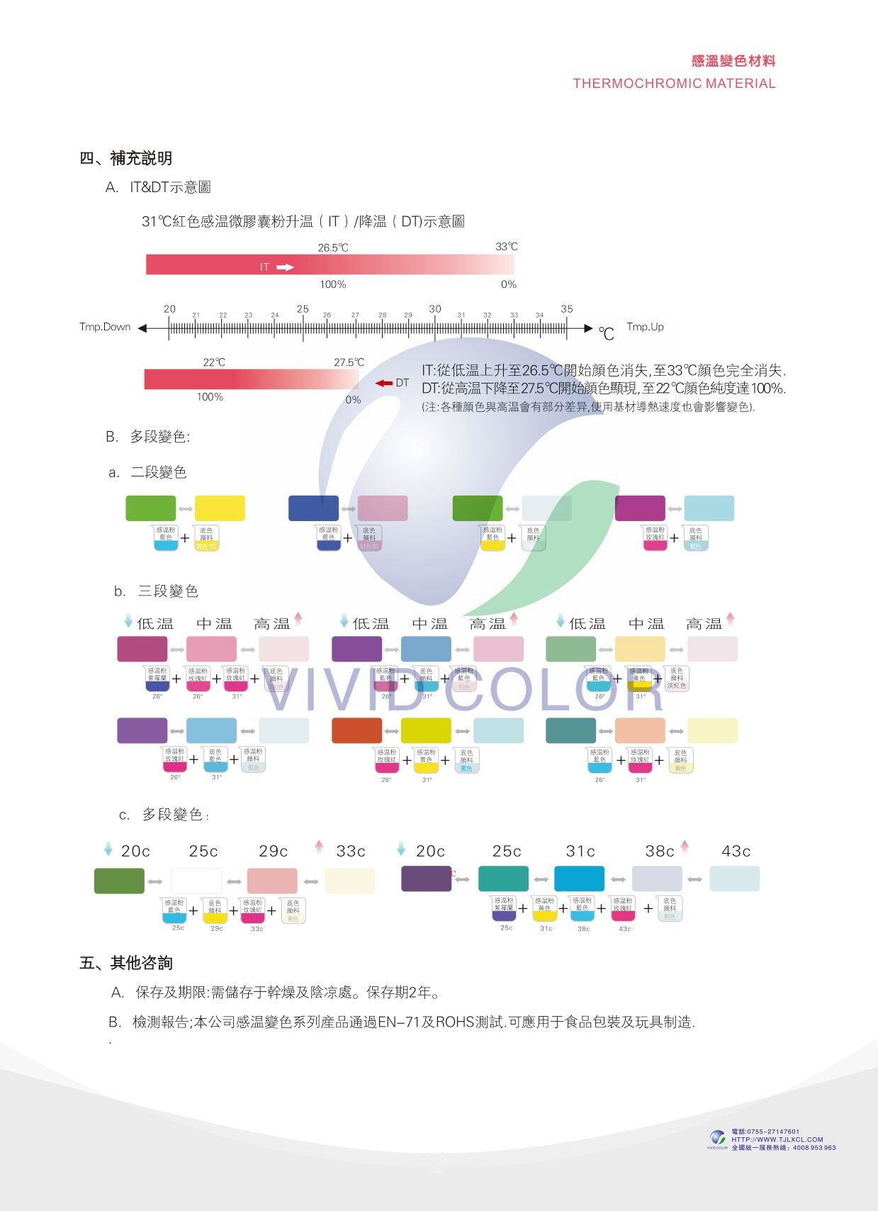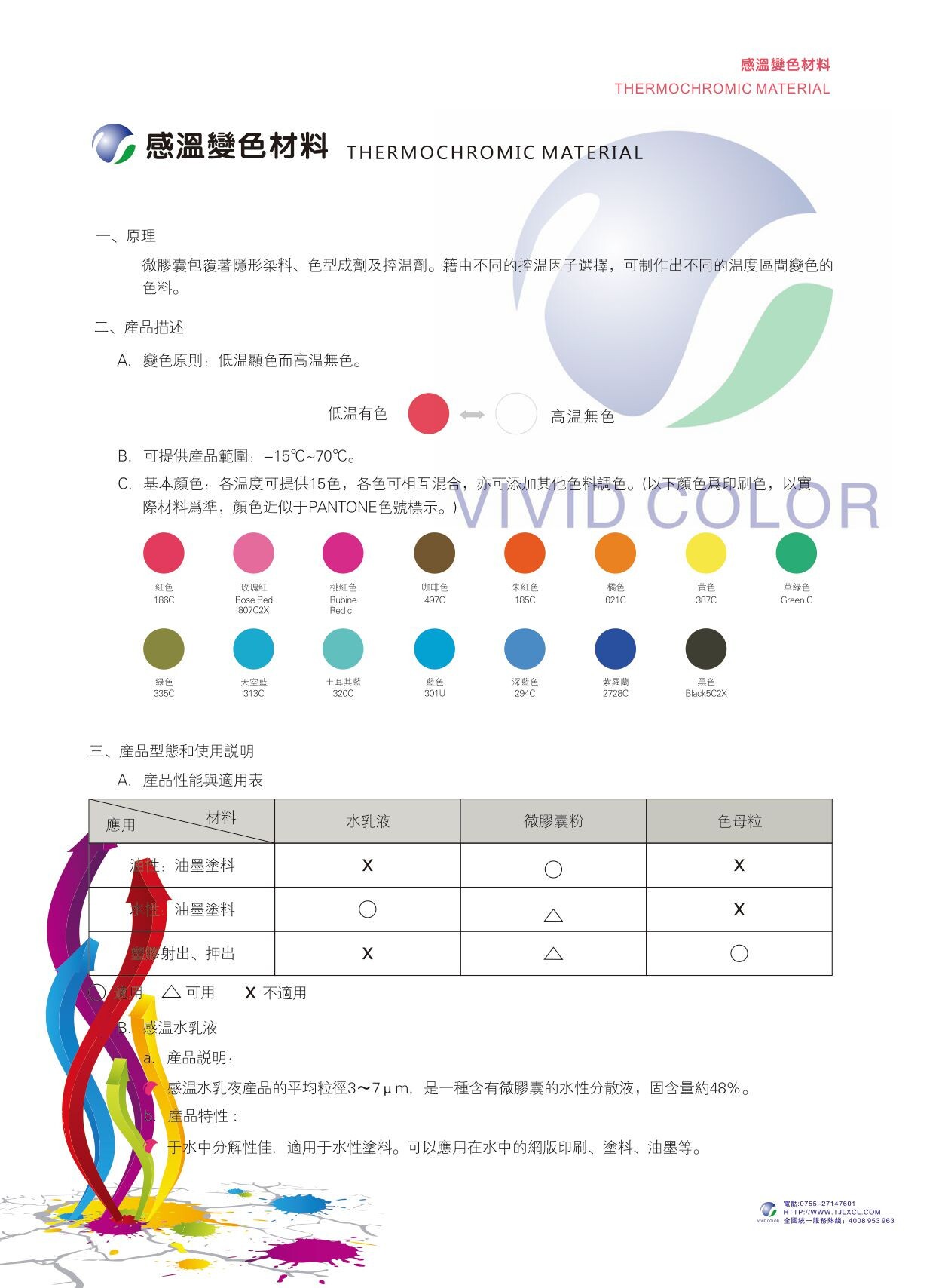 可變化溫度區(qū)間為-15℃到71℃,可因各種產(chǎn)品應(yīng)用之不同需求,而設(shè)定不同的溫變臨界溫度,一般變色溫度設(shè)定間隔2℃到10℃,色度從低溫到高逐漸遞減,直到接近透明。常用的溫度有: 適合冷飼食品使用的8℃、15℃。適合人體接觸使用有31℃、33℃、38℃,適合熱飲食品標示使用的45℃、65℃等。