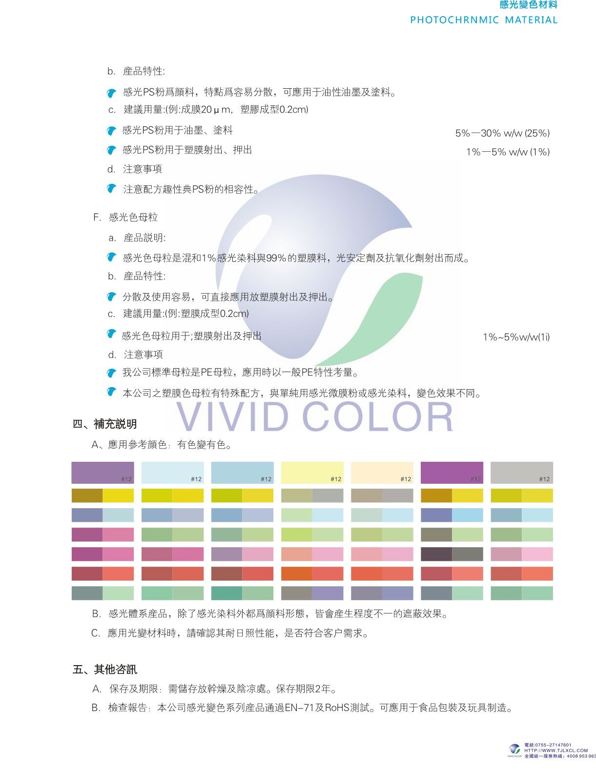 3.感光變色PS色粒粉之粒徑為7-8um,耐溫度最高為280℃。