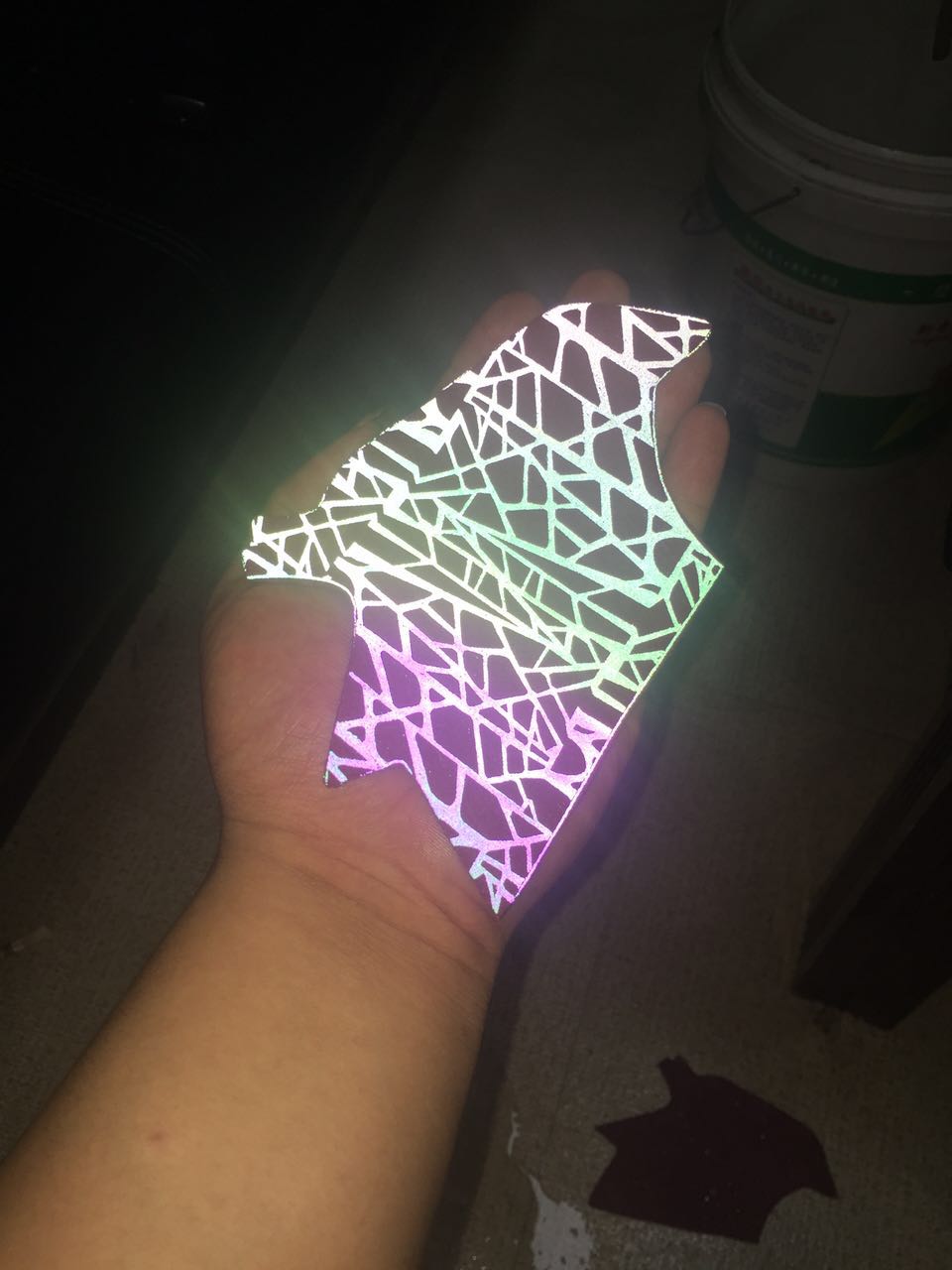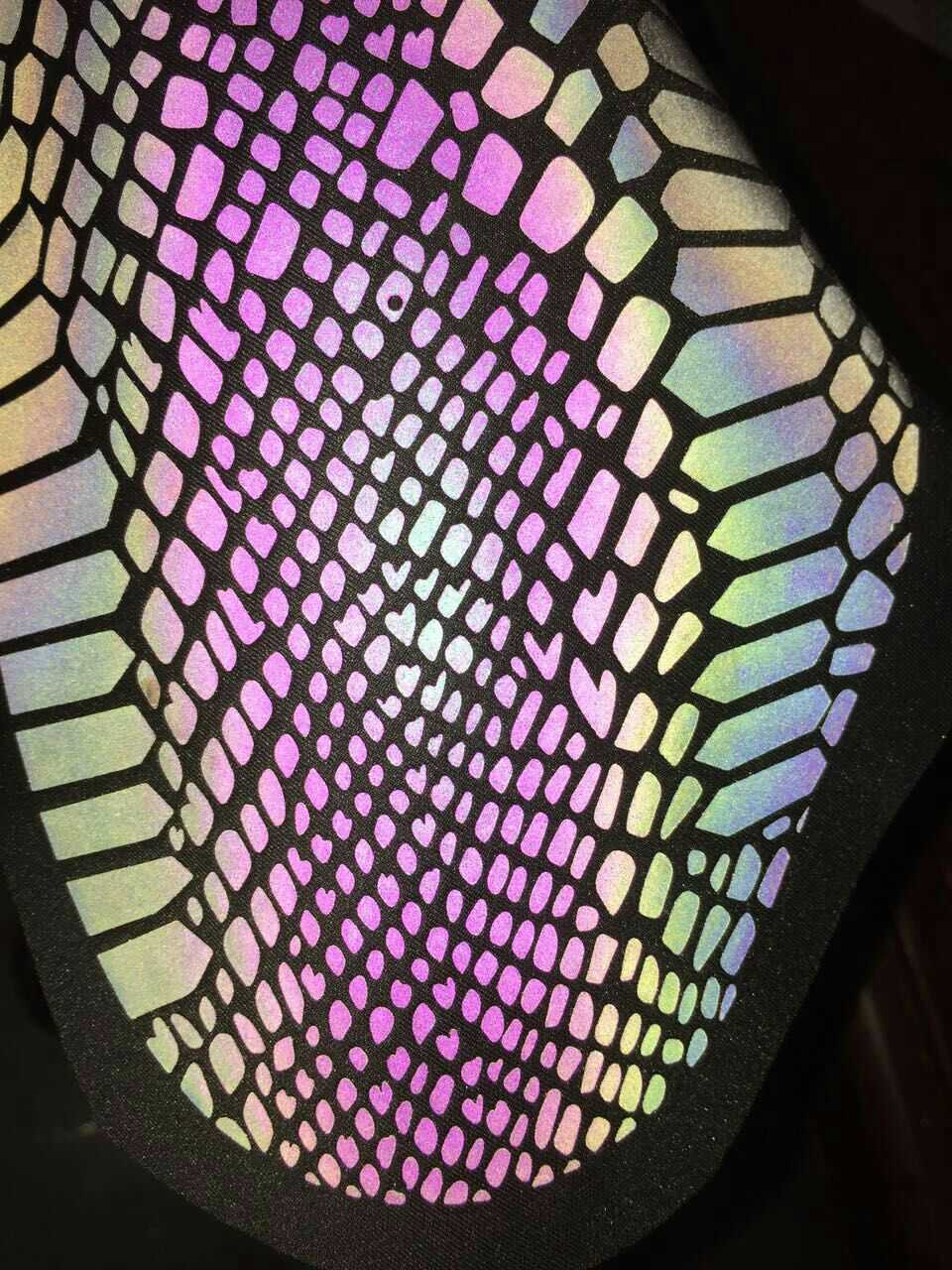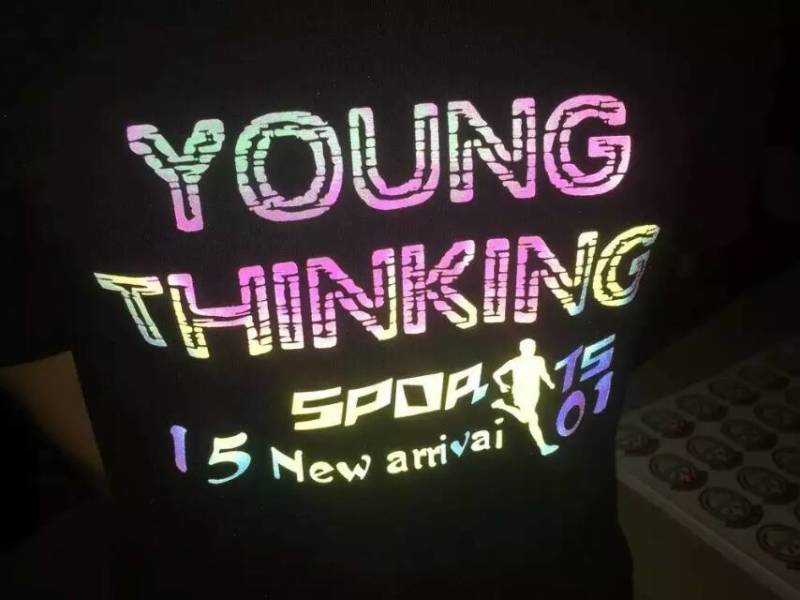 幻彩反光膜又名:七彩反光轉(zhuǎn)印膜、彩虹反光轉(zhuǎn)印膜、透明五彩反光轉(zhuǎn)印膜,透明七彩反光轉(zhuǎn)印膜、炫彩反光轉(zhuǎn)印膜、多彩反光轉(zhuǎn)印膜是在涂有幻彩效果的離型PET膜上粘附一層反光玻璃微珠所構(gòu)成。操作方法是通過絲網(wǎng)印刷將油墨和熱熔膠反向地印刷到幻彩反光轉(zhuǎn)印膜的背面而獲得各種炫麗的反光彩色的效果和精美的七彩圖文或服裝LOGO,再將這些圖文或LOGO通過熱壓燙(熱轉(zhuǎn)印的方法)轉(zhuǎn)印到織物或其他基材上即形成各種七彩反光效果。白天顯示炫彩的效果、在夜間或視線不良環(huán)境里,反光圖文不僅能明顯提高穿著者的被可視性,還對穿著者的服飾起到了裝飾美觀的作用。方便快捷且不易脫落?捎糜诔梢隆⒀b飾布和其它各種面料上。經(jīng)常適用于運動服、內(nèi)衣、廣告衫、文化衫、箱包、帽子、圍裙等產(chǎn)品。產(chǎn)品反光亮度高、效果好、手感軟、立體感強、轉(zhuǎn)移方便、耐水洗、環(huán)保。