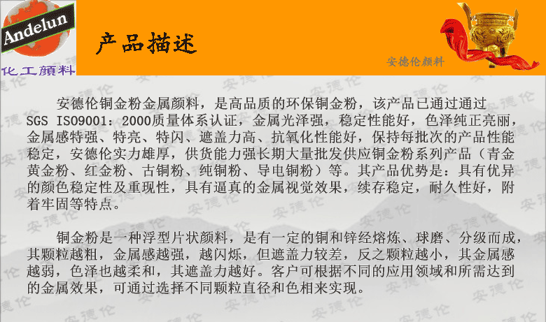 首頁(yè) > 產(chǎn)品供應(yīng) > 印花材料 > 深圳市安德倫顏料有限公司(銷(xiāo)售部) > 油漆油墨專(zhuān)用高亮銅金粉銅金粉價(jià)格