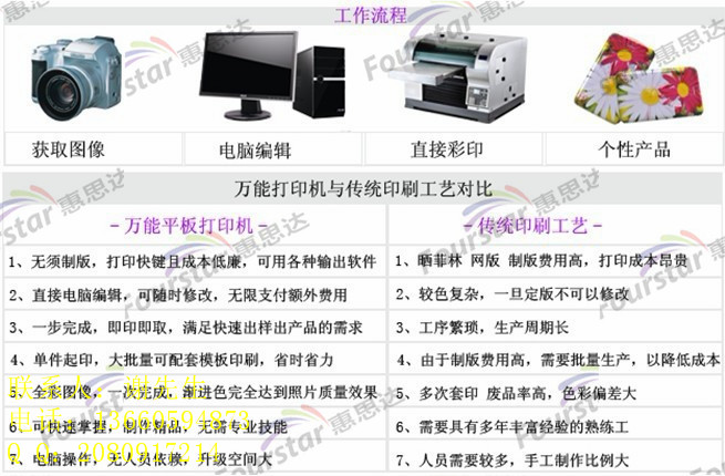 一、它無(wú)需制版、曬版、重復(fù)套色的步驟,無(wú)需絲網(wǎng)印刷和熱轉(zhuǎn)印方式所需要的各式型號(hào)的 工具、材料。采用我們的萬(wàn)能打印機(jī),只需要另外準(zhǔn)備一臺(tái)普通電腦。一個(gè)操機(jī)人員就可以完全獨(dú)立的進(jìn)行印刷操作,省人力物力,并且方式簡(jiǎn)單,立等可取,對(duì)操機(jī)人員的經(jīng)驗(yàn)要求低,只要了解簡(jiǎn)單的圖片處理軟件就可以了。