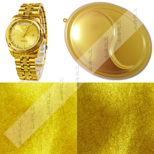 黃金粉主要有:緞金色、皇室緞金、珍珠金黃、皇室金色、瑪雅金阿茲特克金、古典金明亮金色、陽光金色、閃爍金色、綠口青金、紅光金色、奧林匹克金等150目,200目,400目,800目,CQV默克金黃珠光粉。