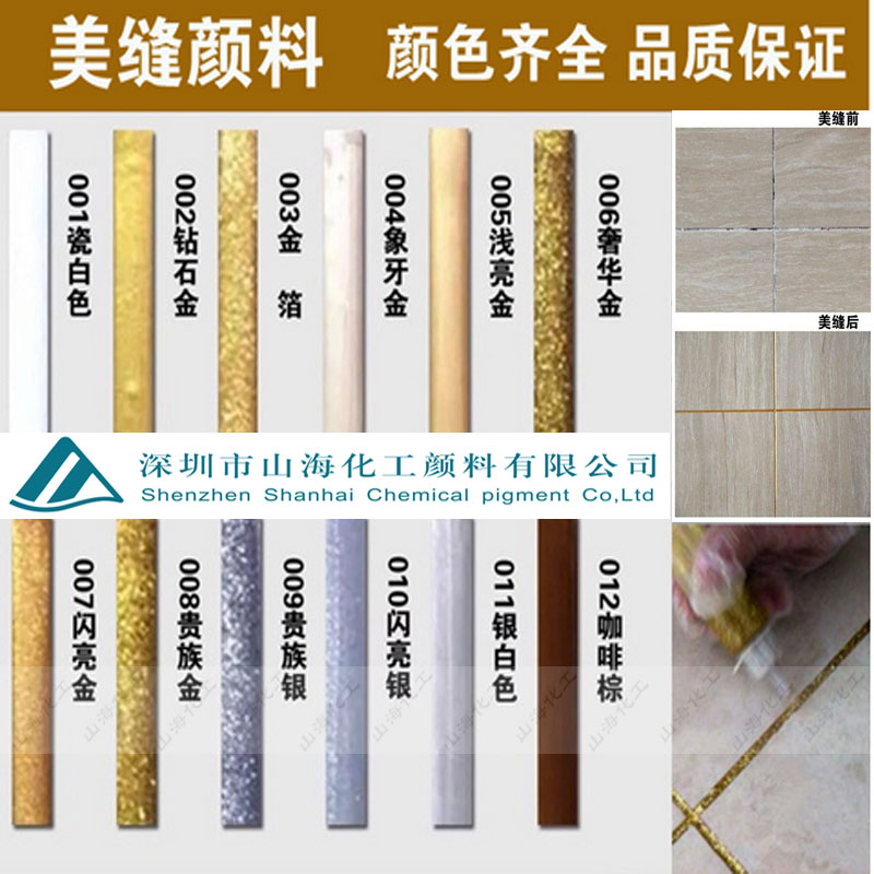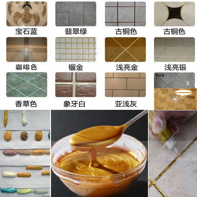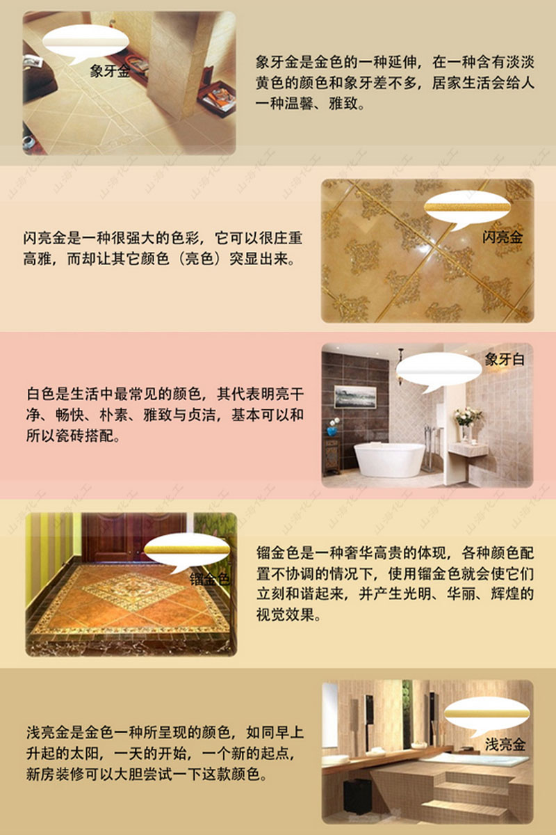 山;っ揽p顏料粉末狀有閃亮金、銀灰、月光銀、咖啡棕、黃金、淺金、鎦金、鎏金、象牙金、象牙白、銀白、珍珠白、淺亮金、紅寶石、亮金色、新象牙金、玫瑰金、黑珍珠、金箔金、米黃、鉆石金、鉆石白等多種顏色,主要是配亮光磚如;u、釉面磚、仿古磚和亞光磚使用等使用。其色彩艷麗豐富,光澤性強(qiáng),有質(zhì)感,且質(zhì)地細(xì)膩,與亮光磚搭配色彩更加協(xié)調(diào),是最佳的瓷磚伴侶。