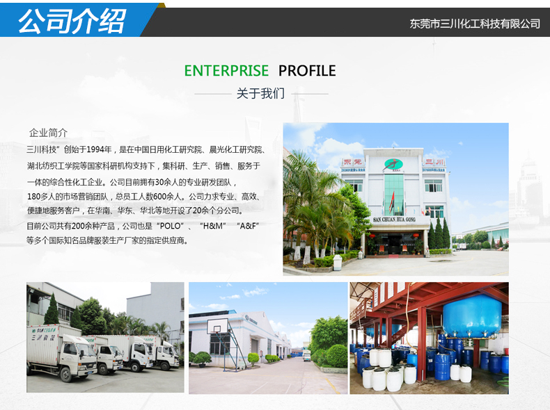 我公司是中國日用化工研究院、晨光化工研究院、武漢紡織工學(xué)院的技術(shù)協(xié)作企業(yè)。我們專注紡織助劑行業(yè)26年,集研發(fā)、生產(chǎn)銷售為一體的化工企業(yè)。